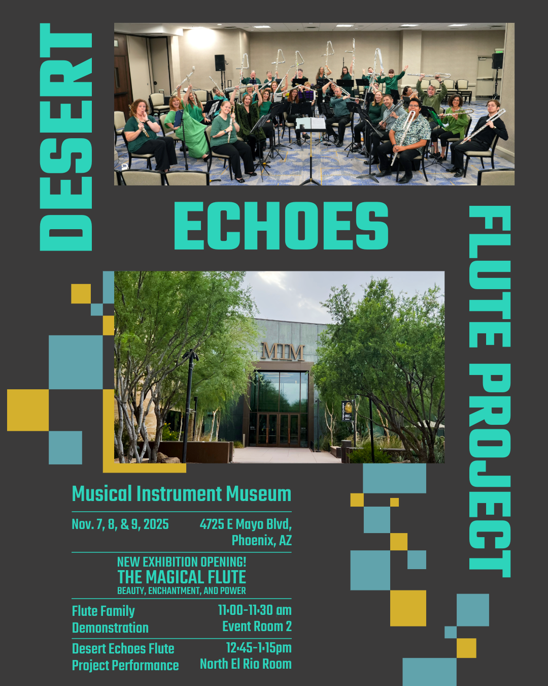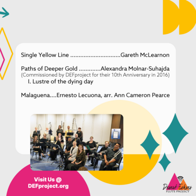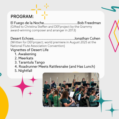 Experience the captivating sounds and melodies of the Desert Echoes Flute Project in a performance that features works written for the ensemble: El Fuego de la Noche by Grammy-award winning composer and arranger Bob Freedman was composed as a gift in 2013, Lustre of the dying day is the first movement of a work by Alexandra Molnar-Suhajda commissioned for the 10th anniversary of DEF Project, and Jonathan Cohen’s new work, Desert Echoes, Vignettes of Desert Life, written for DEF Project who gave the world premiere at the 2025 NFA Convention in Atlanta. The latter work is a collection of movements depicting the awakening dawn of Aravaipa canyon, Meerkats at the Phoenix Zoo, a Tarantula Tango, an encounter between a roadrunner and a rattlesnake (lunch is involved), and lastly, Nightfall. The program includes Single Yellow Line by Gareth McLearnon, a terrific groove piece with fun extended techniques and a fabulous transcription of Ernesto Lecuona’s Malaguena arranged by Ann Cameron Pearce. This renowned flute choir uses piccolos, Eb soprano flute, C flute, alto flutes, bass flutes, three contrabass flutes and the double contrabass flute.